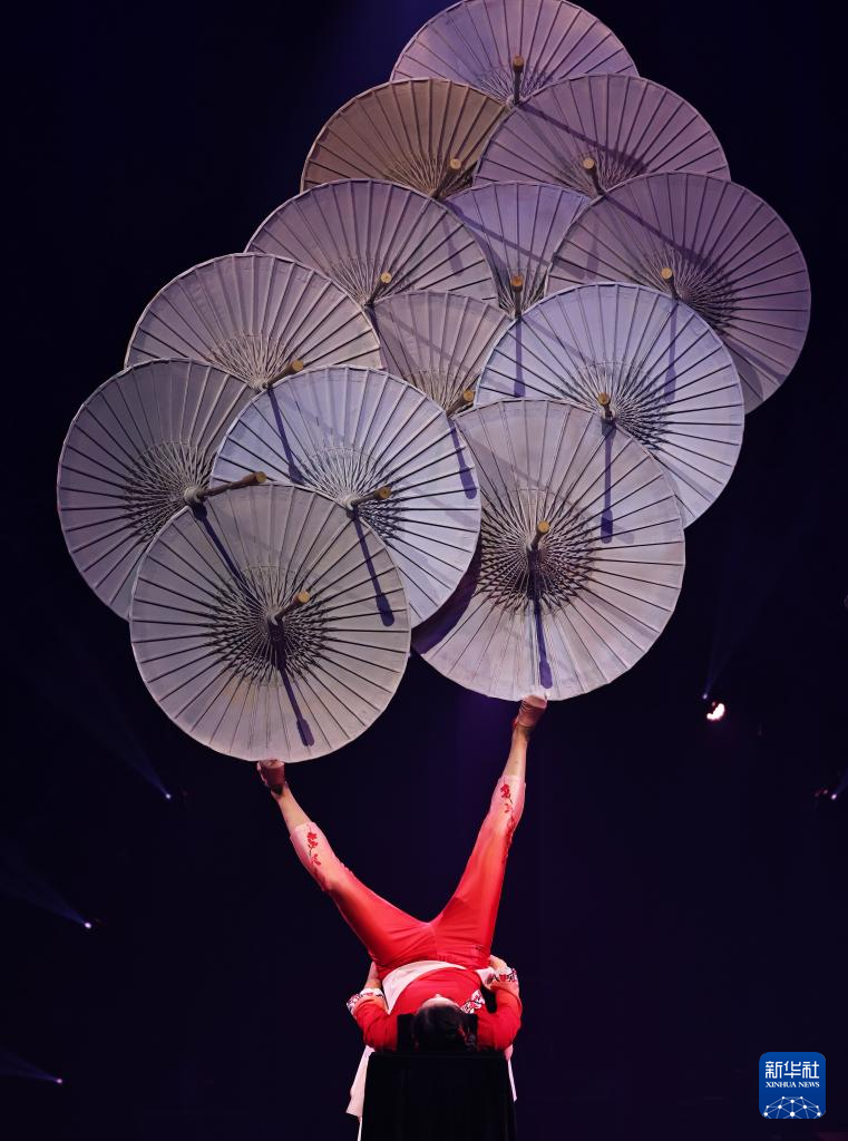 12月8日,演員在法國巴黎舉行的中國雜技“奇妙之夜”演出上表演《蹬傘》。