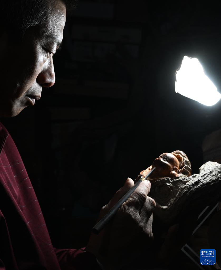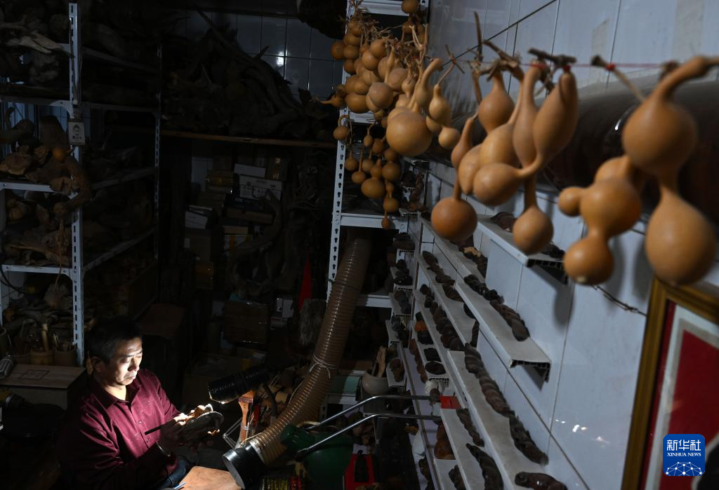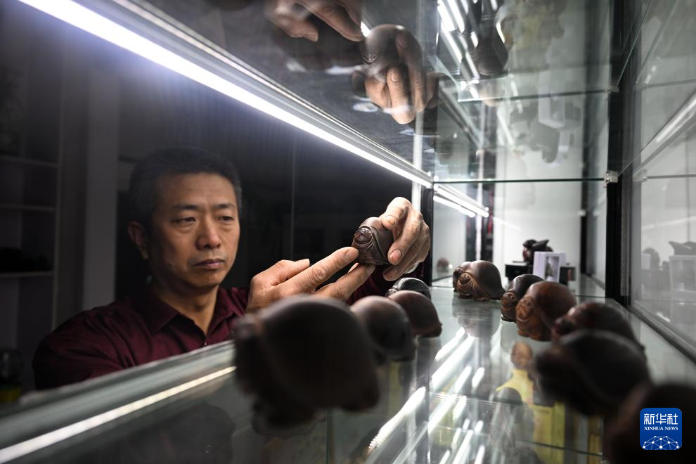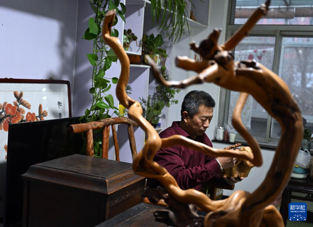 12月12日,李明軍在家中擺放自己的根雕作品。