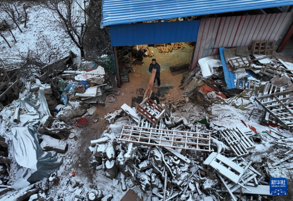12月12日,李明軍在院子里整理木材(無人機照片)。