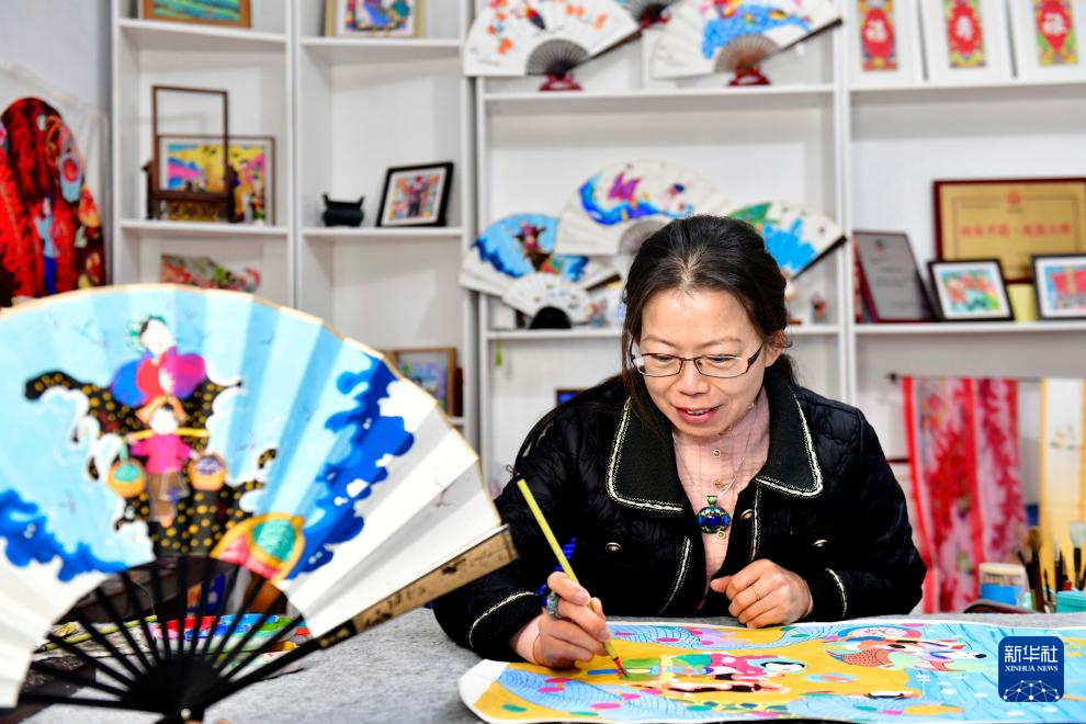 12月13日,在日照市農民畫非遺工坊,非遺傳承人喬諾在創作農民畫。