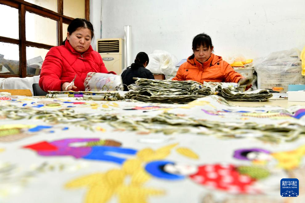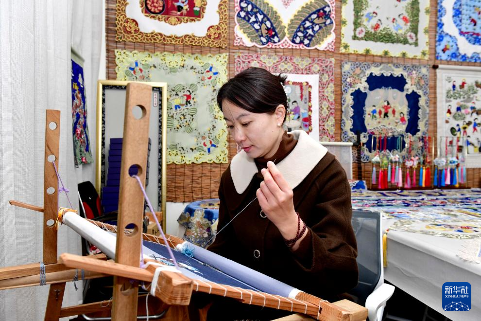 12月13日,在日照市刺繡非遺工坊,工作人員在加工刺繡產品。