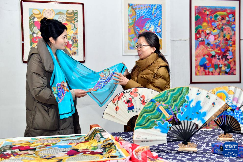 12月13日,在日照市農民畫非遺工坊,非遺傳承人喬諾(右)在介紹農民畫衍生文創產品。