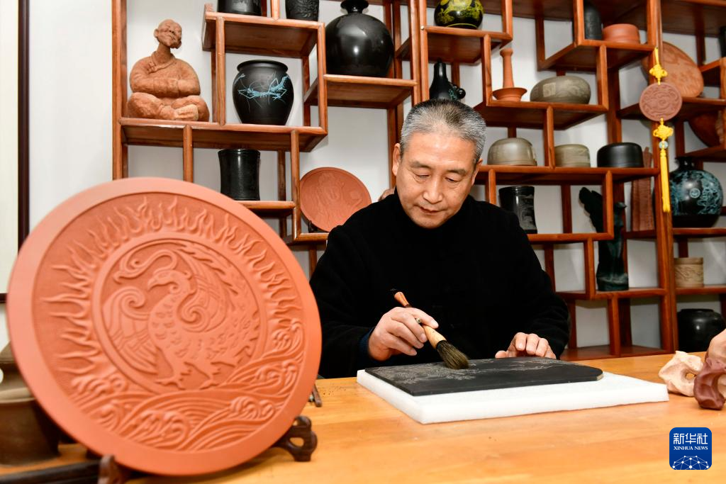 12月13日,在日照市平面陶非遺工坊,非遺傳承人徐冰在創作平面陶。