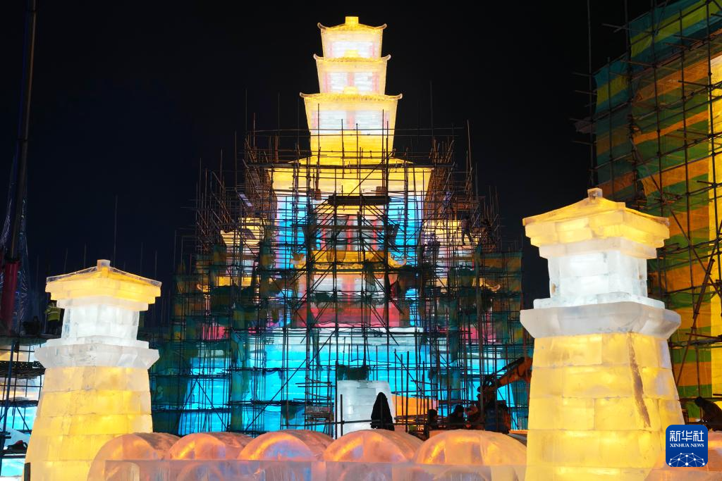 12月12日,工人在哈爾濱冰雪大世界園區建設現場施工。