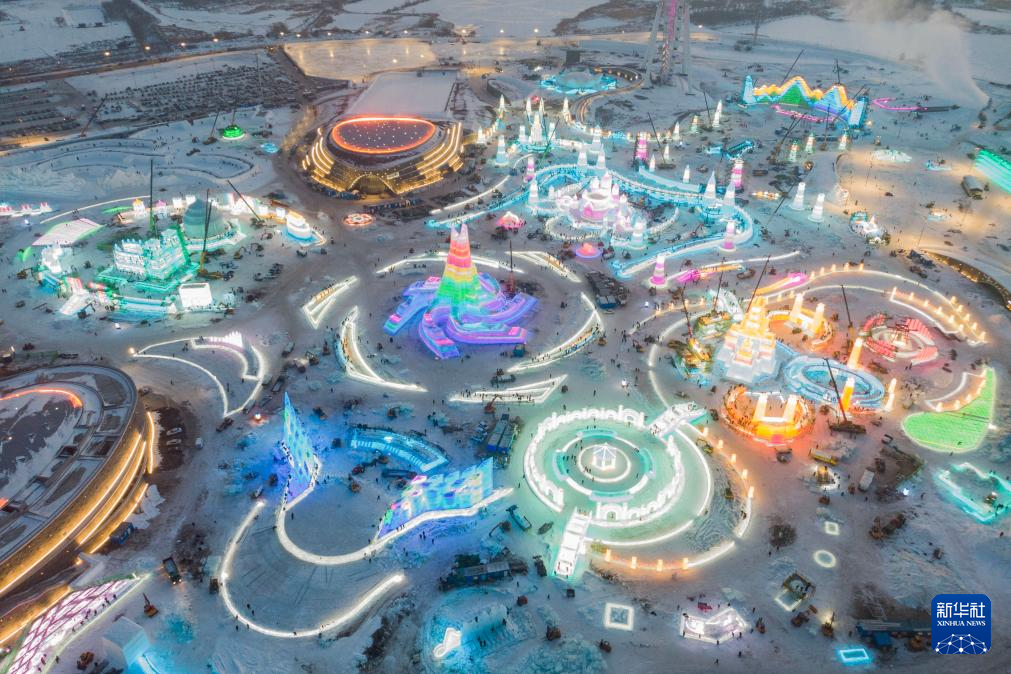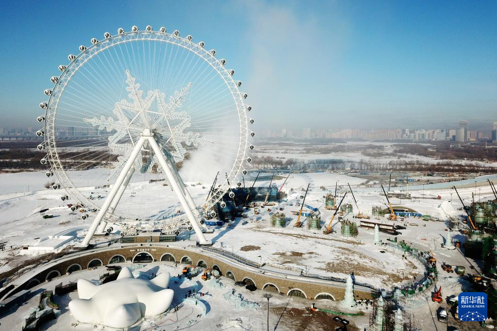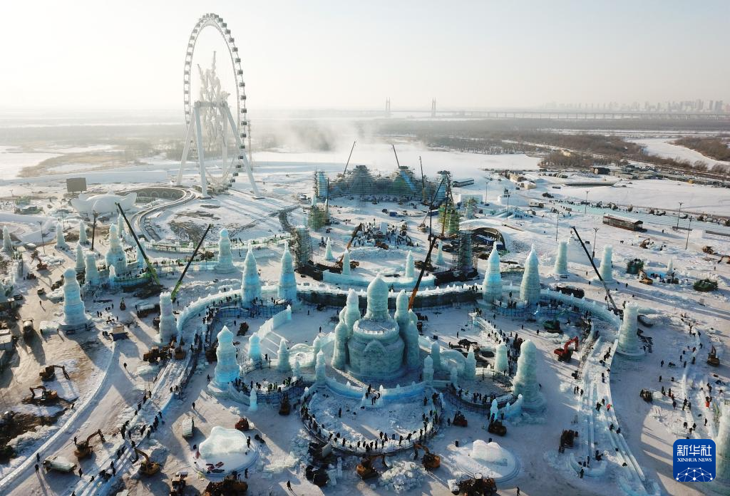 12月12日,工人在哈爾濱冰雪大世界園區建設現場施工(無人機照片)。
