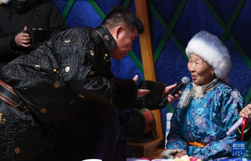12月21日,烏蘭牧騎隊員在阿其圖烏拉蘇木演出過程中和牧民互動。