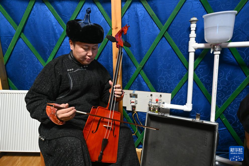 12月21日,烏蘭牧騎隊員在阿其圖烏拉蘇木進行馬頭琴演奏表演。