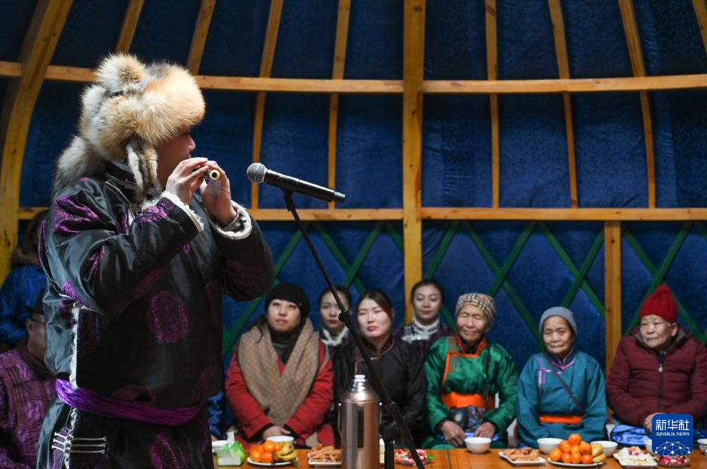 冬日里,內蒙古錫林郭勒盟蘇尼特右旗烏蘭牧騎的隊員來到阿其圖烏拉蘇木,為當地牧民送去獨具特色的文藝表演,也為冬日的草原增添色彩。