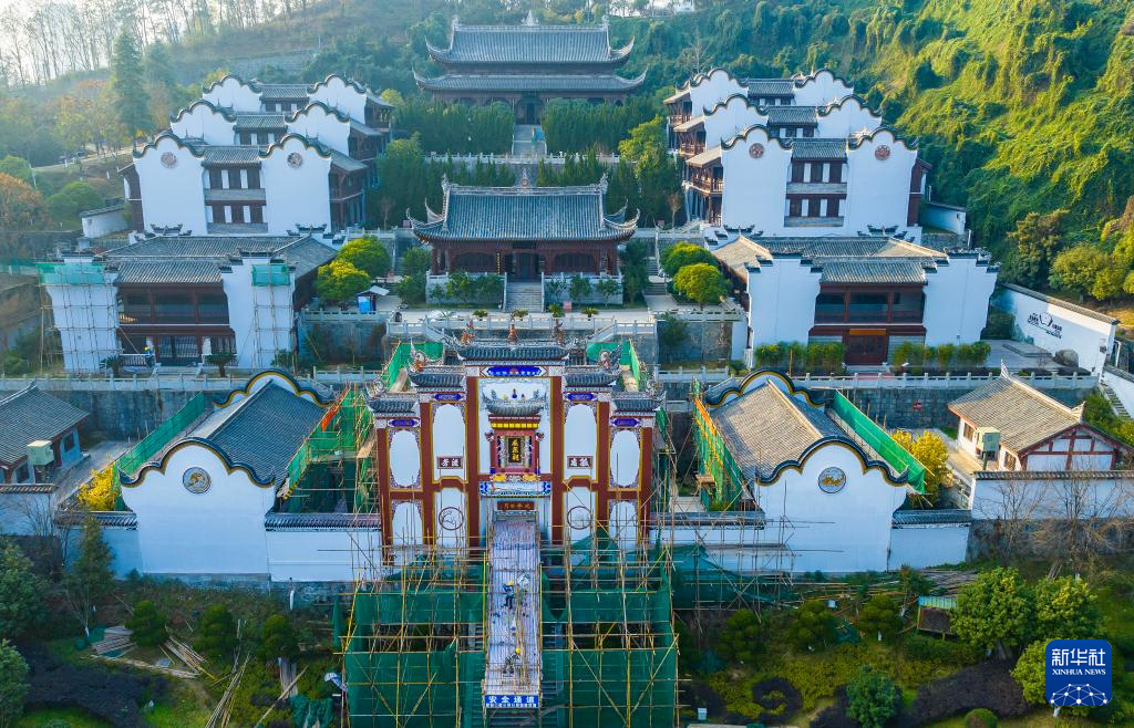 12月24日,工人在秭歸縣屈原祠山門前拆除腳手架(無人機照片)。