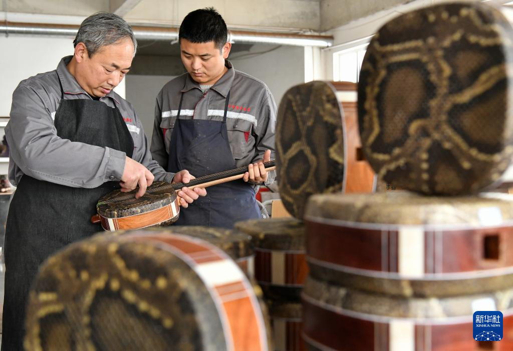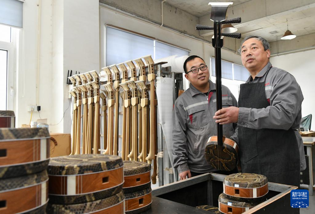 12月24日,三弦制作藝人在河北省肅寧縣一家民族樂器生產企業車間內檢查產品質量。