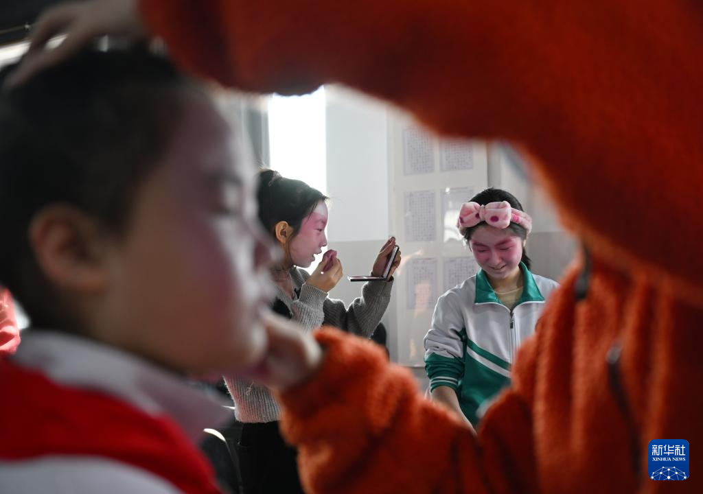 12月27日,在保定市河北小學,學生在上臺演出前化裝。