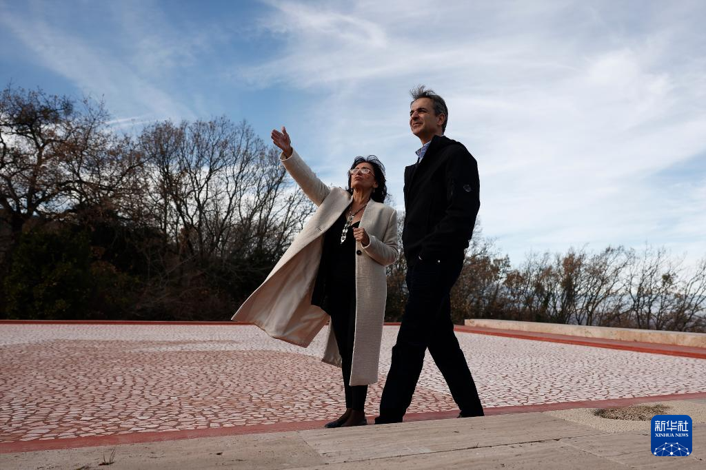 1月5日,希臘總理米佐塔基斯(右)參觀位于希臘北部的古馬其頓王國宮殿遺址。