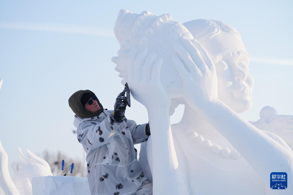 1月8日,選手在太陽島雪博會園區內制作雪雕。
