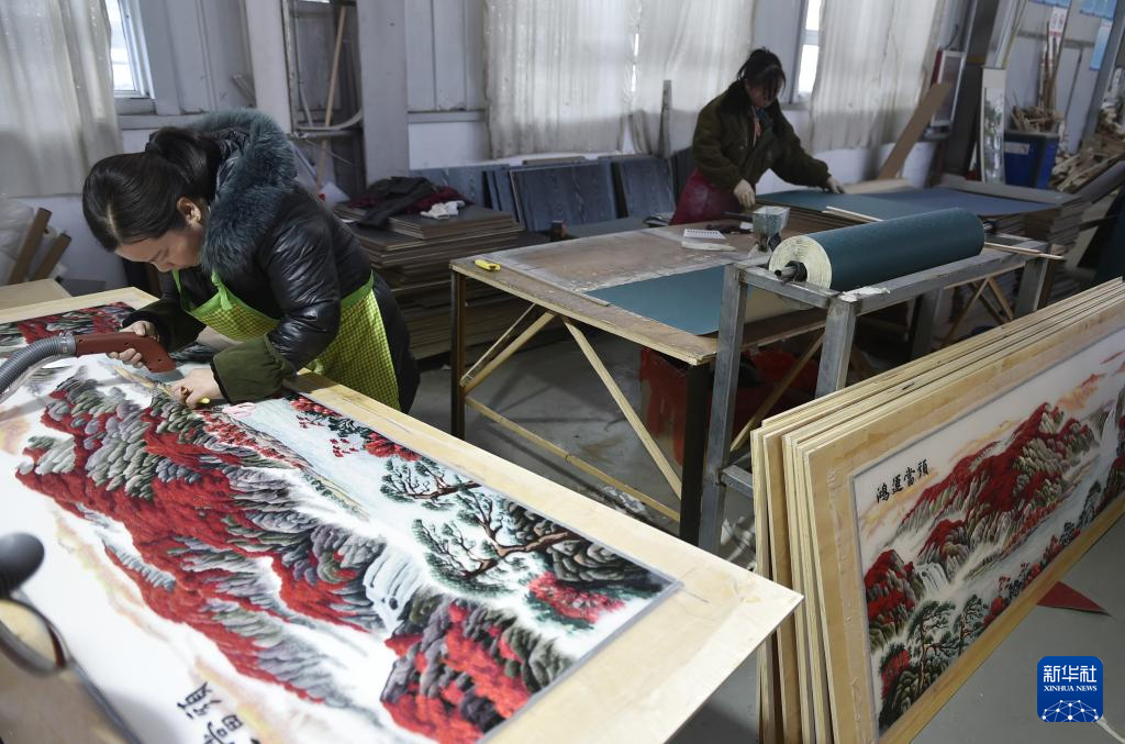 1月9日拍攝的汝州市汝繡產業園一家機繡企業的產品展廳。