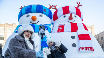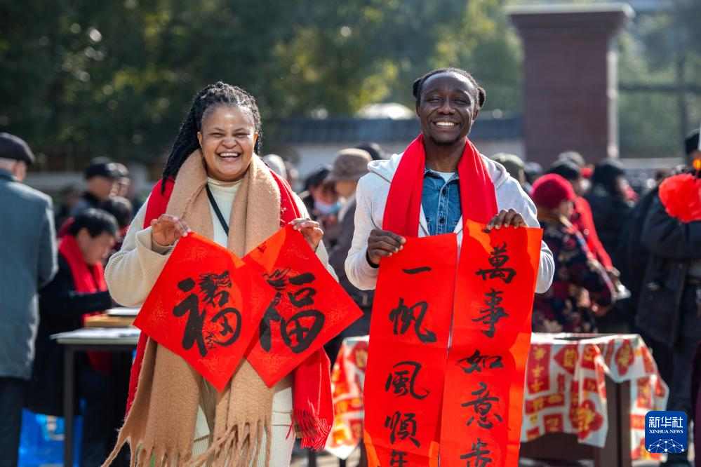 1月11日,在浙江省湖州市長興縣雉城街道高家墩居民區,外國友人展示領取的新年春聯和福字。