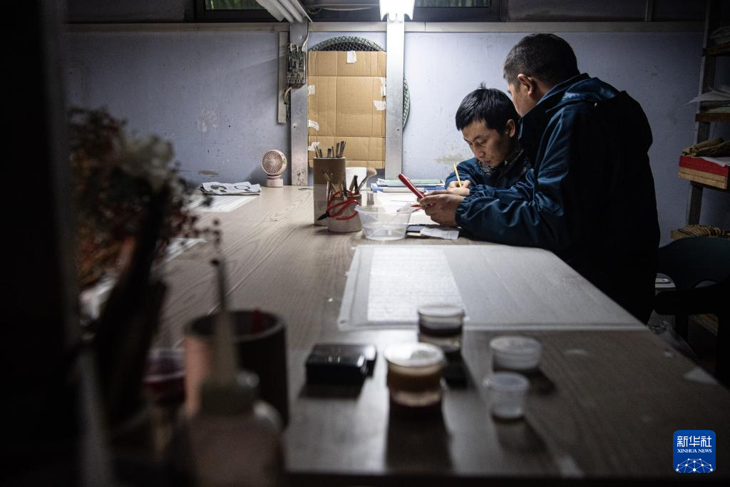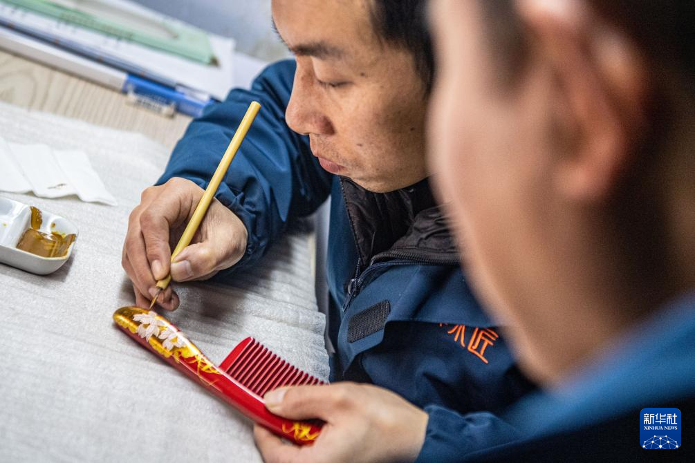 在重慶萬州譚木匠木梳非遺工坊內,崔國文(左)在師父俞達洪的指導下進行大漆工藝創作(1月5日攝)。