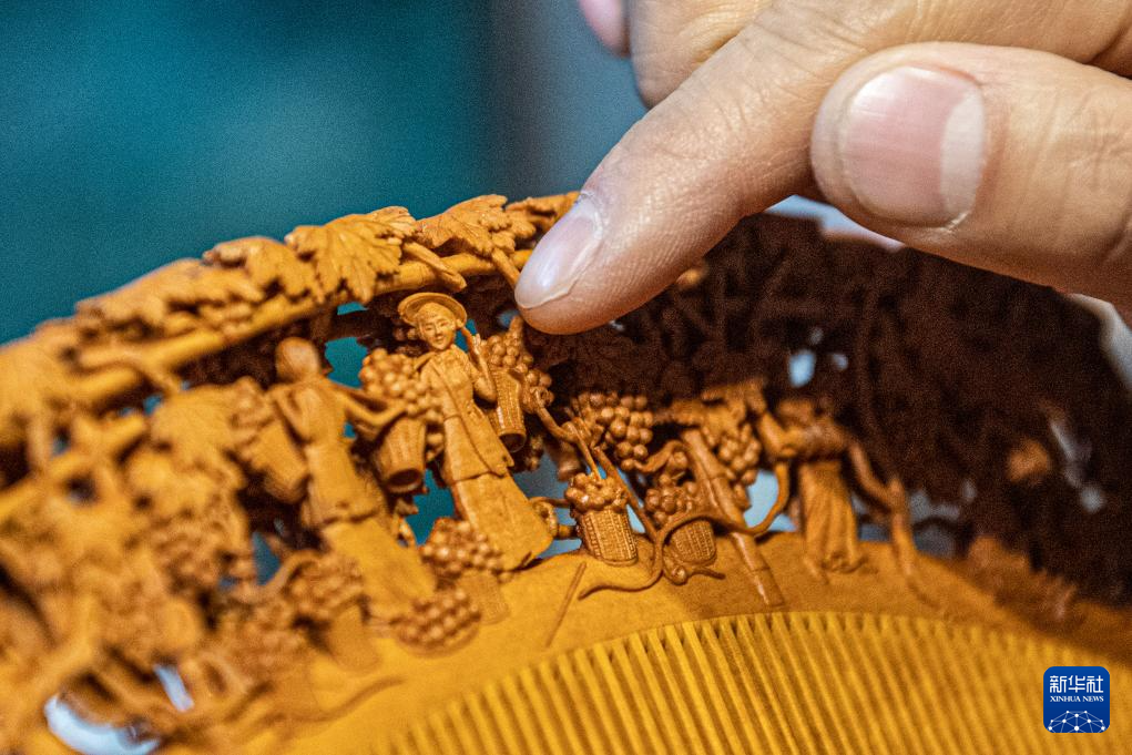 在重慶萬州譚木匠木梳非遺工坊內,俞達洪在展示自己的雕刻梳作品“豐收”(1月5日攝)。
