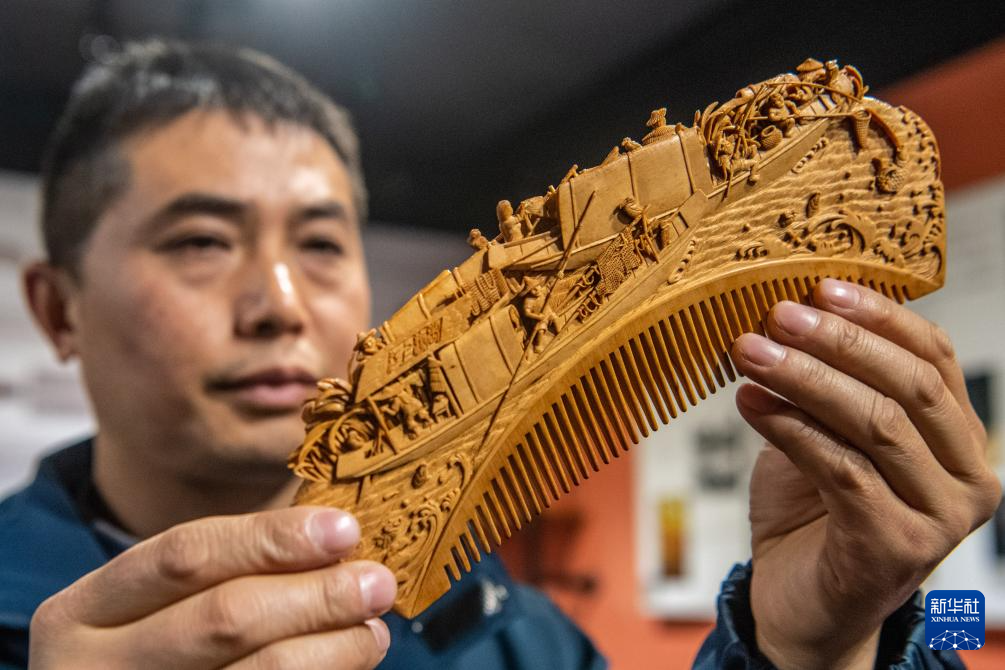 在重慶萬州譚木匠木梳非遺工坊內,俞達洪在展示自己的雕刻梳作品“江上漁者”(1月5日攝)。