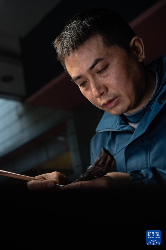 在重慶萬州譚木匠木梳非遺工坊內,俞達洪在進行雕刻工藝創作(1月5日攝)。