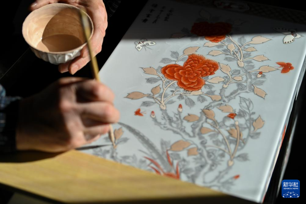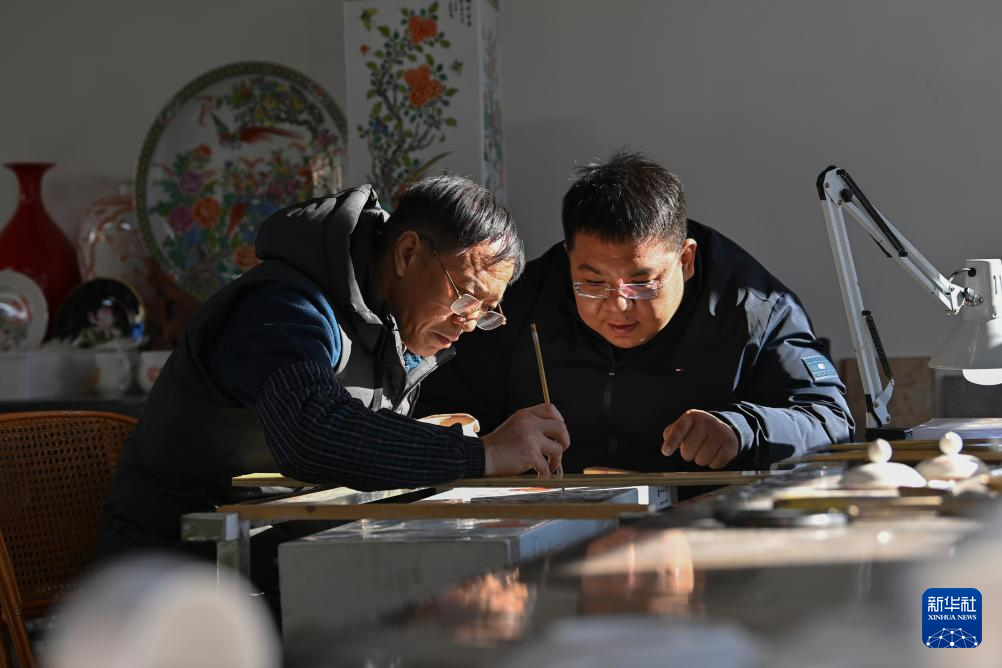 在位于山西省長治市上黨區紅綠彩村的生產基地內,工作人員在瓷器上進行彩繪創作(1月4日攝)。