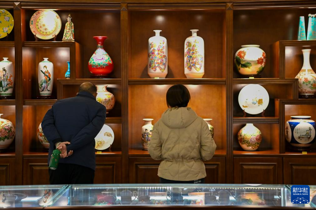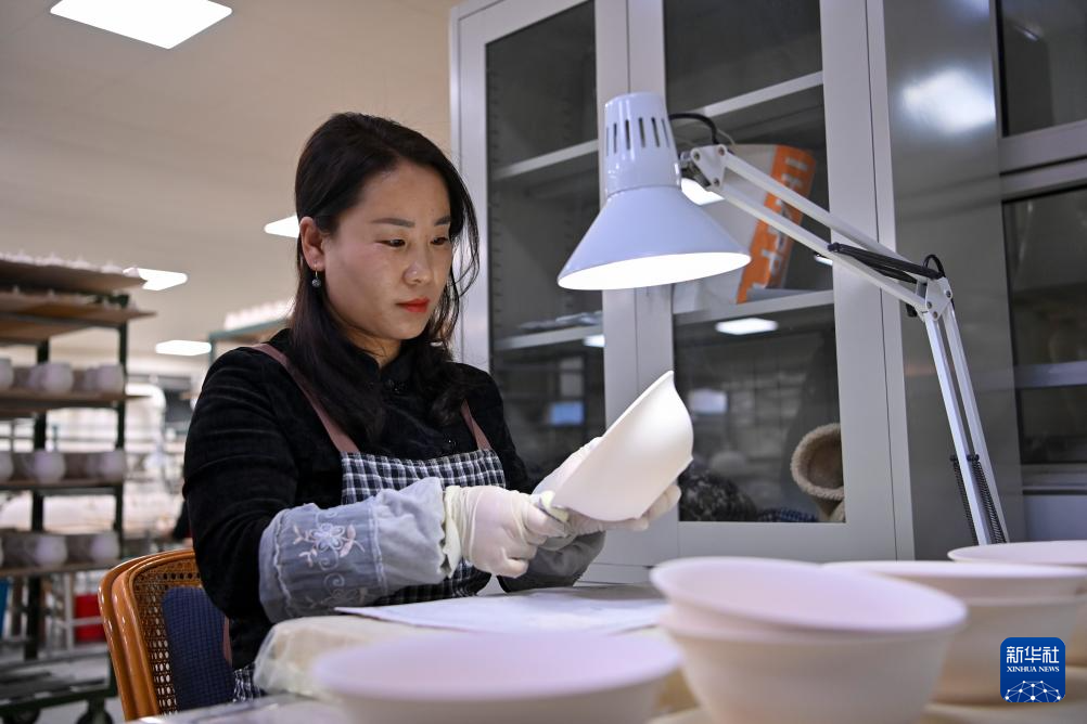 在位于山西省長治市上黨區紅綠彩村的生產基地內,工作人員在檢查瓷器有無瑕疵(1月3日攝)。