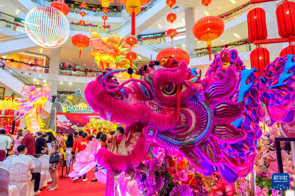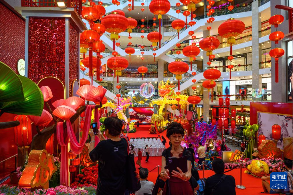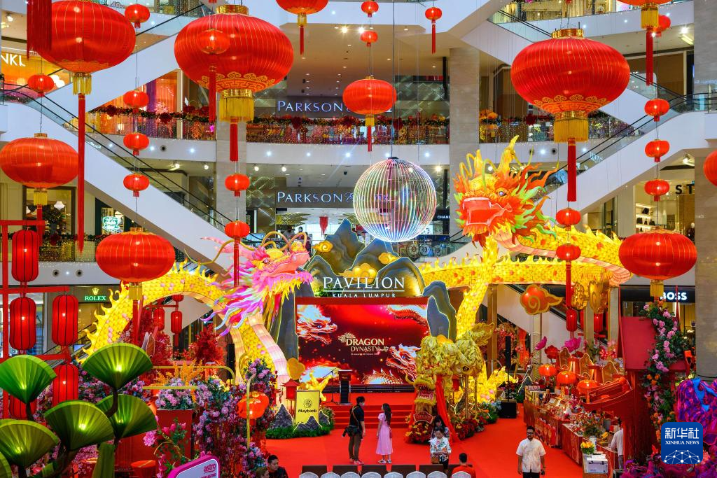 當日,馬來西亞首都吉隆坡的一家商場為迎接2024年甲辰龍年到來,特別打造以龍為主題的新年年景,讓前來的游客打卡拍照,提前感受濃濃的春節氣息。