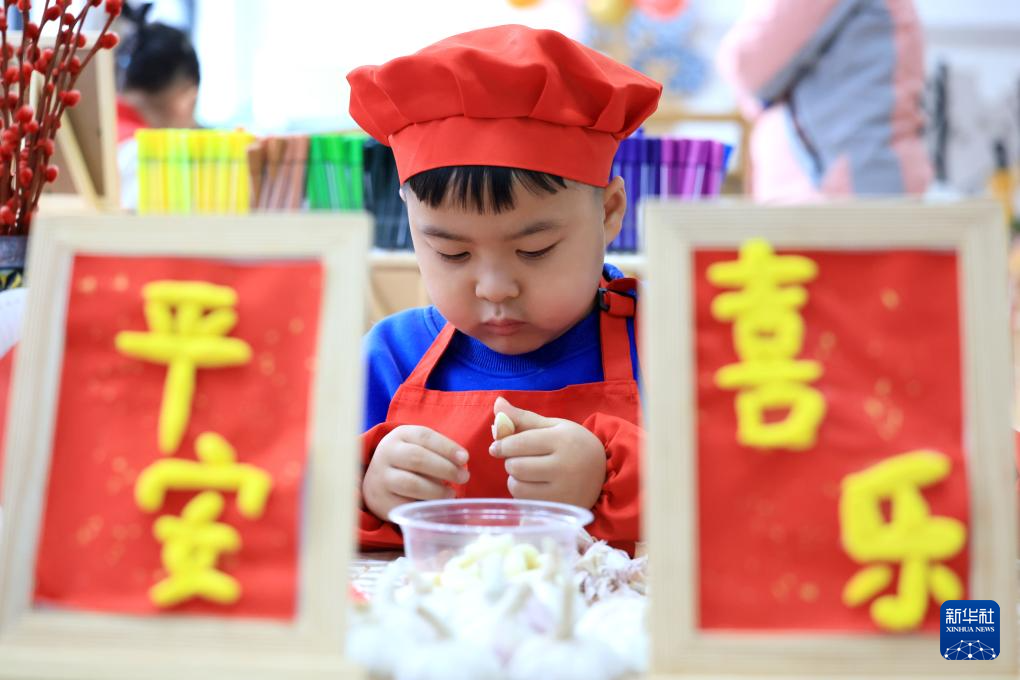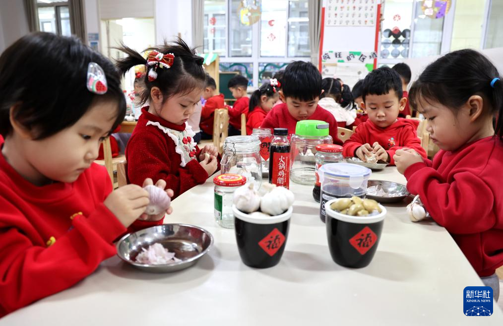 1月17日,山東省濱州市濱城區清怡幼教集團第十一實驗幼兒園的孩子們在學習制作臘八蒜。