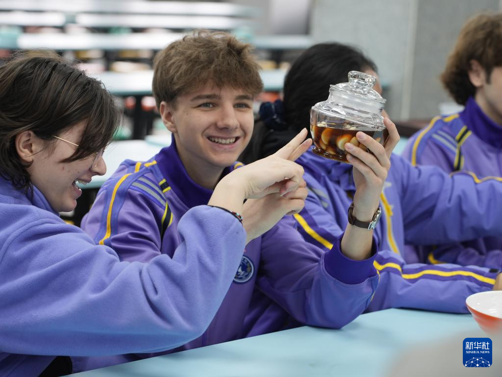 1月17日,河北省石家莊市第四十二中學的留學生體驗臘八蒜制作。