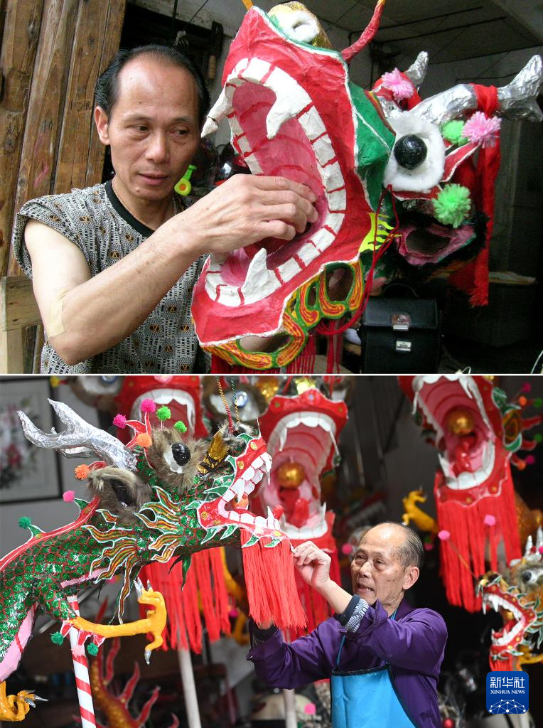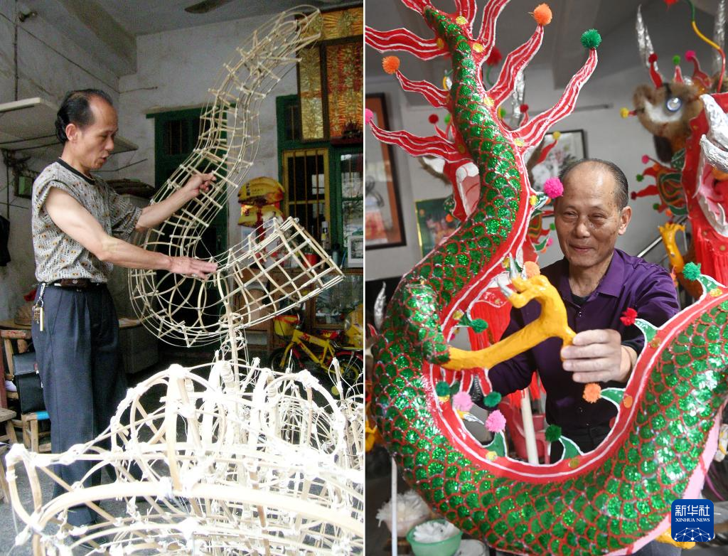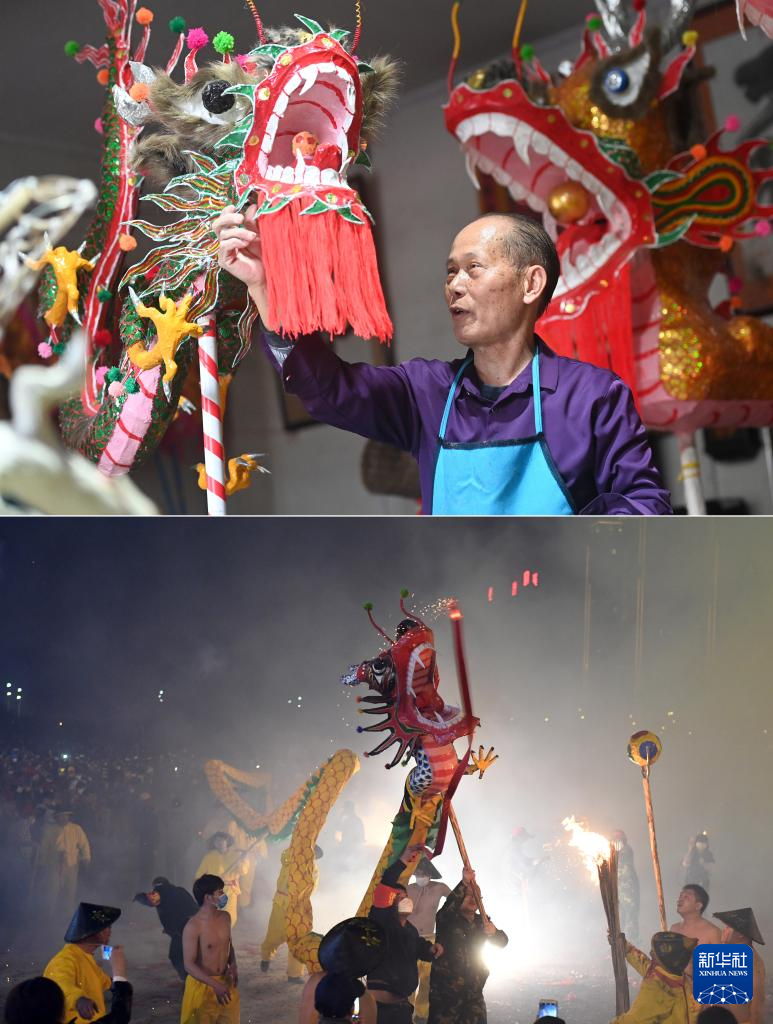 拼版照片:上圖為在廣西賓陽縣賓州鎮三聯街,鄒玉特在扎制炮龍(2024年1月16日攝);下圖為在廣西賓陽縣賓州鎮,人們在賓陽炮龍節上舞炮龍(2017年2月7日攝)。