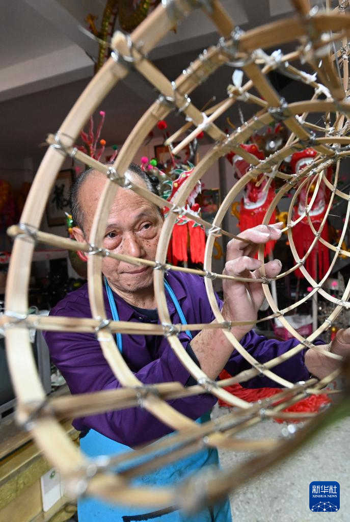 春節臨近,在廣西賓陽縣賓州鎮,手藝人鄒玉特每天都坐在一堆“龍”中間,扎制炮龍。