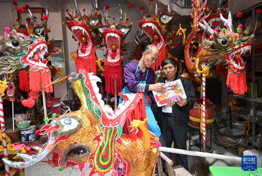1月16日,在廣西賓陽縣賓州鎮三聯街,鄒玉特(左)在挑選扎制炮龍的材料。