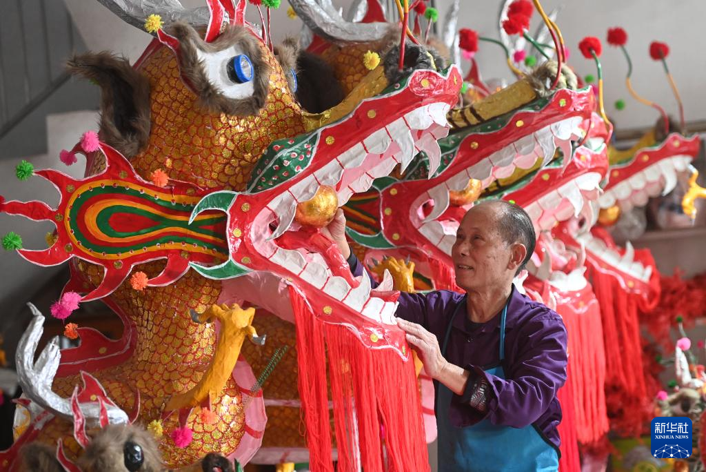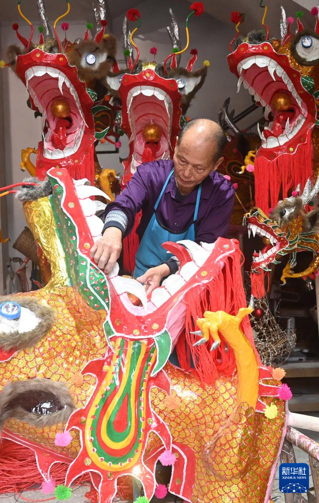 1月16日,在廣西賓陽縣賓州鎮三聯街,鄒玉特在裝飾龍爪。