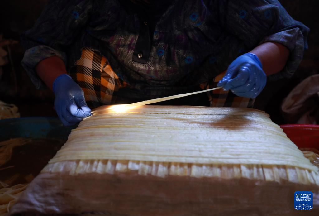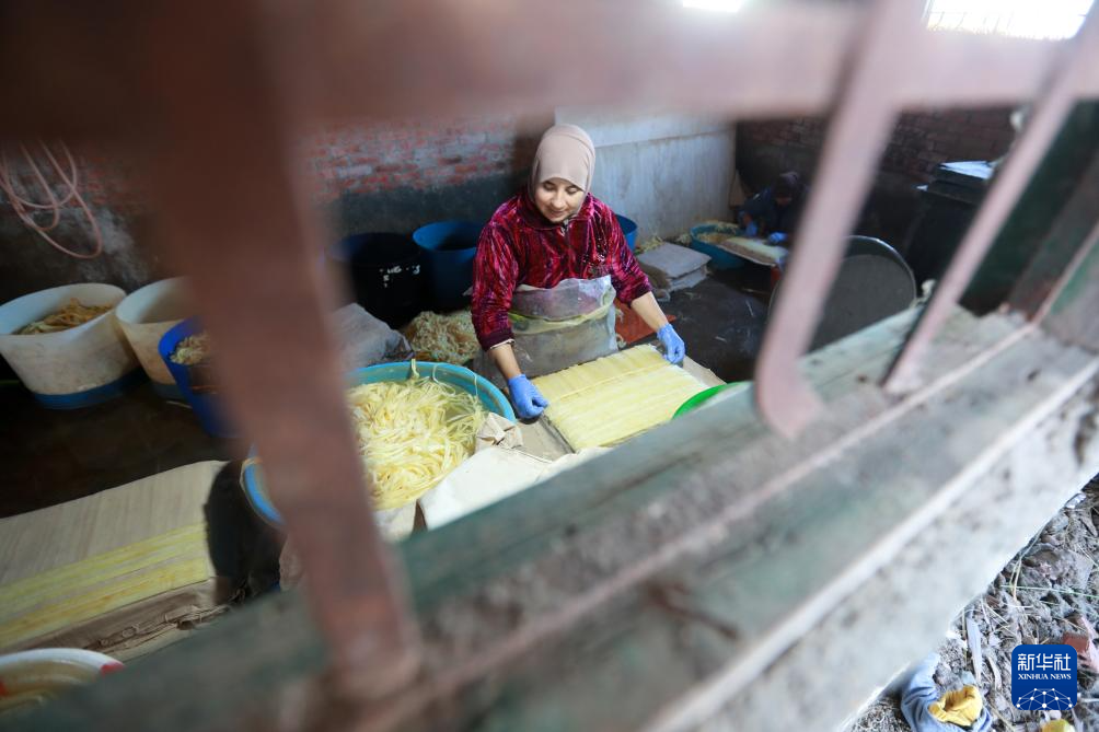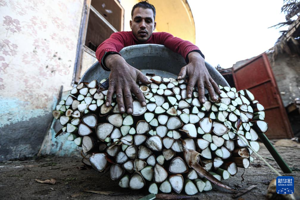 1月16日,在埃及東部省卡拉姆斯村村民賽義德的紙莎草紙制作作坊,村民將紙莎草莖稈切割成薄片。