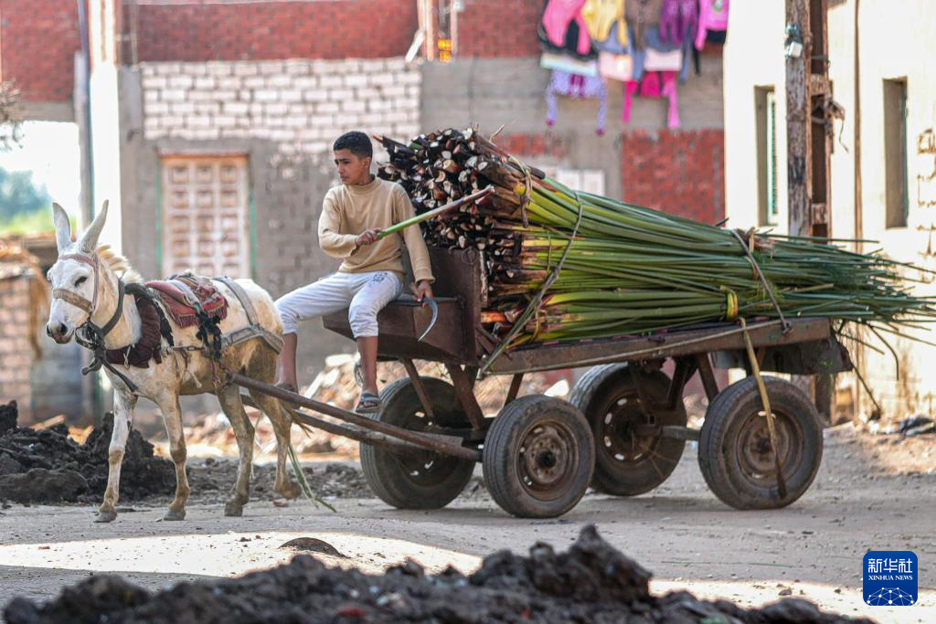 1月16日,在埃及東部省卡拉姆斯村,村民運送收割的紙莎草。