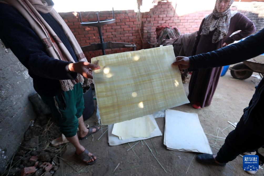 在卡拉姆斯村,記者看到紙莎草扎根泥潭,狀如蘆葦,表皮翠綠,莖稈挺直,其莖是制作紙莎草紙的唯一原料。在村民阿卜杜勒拉赫曼·賽義德的作坊內,人們先將收割的紙莎草根據紙張大小切割長莖,用勒緊的絲線去其表皮并將內瓤分割成薄片,后將薄片浸泡在特制水中讓其變軟變色;之后,將泡好的薄片橫豎疊放成紙張形狀,用布隔開并層層疊加成豆腐塊狀,再用機器壓實,后將成形的紙張夾在紙板內并置于太陽下反復晾曬,最后成紙,其色淡黃,紋理分明。