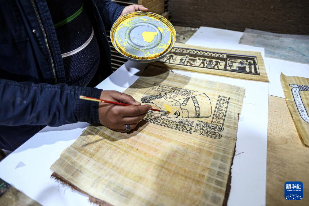 1月16日,在埃及東部省卡拉姆斯村,一名藝術家給用紙莎草紙制作的莎草畫上色。