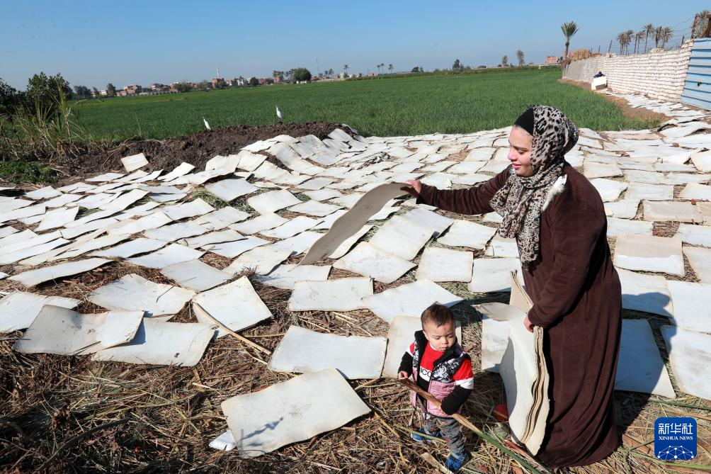 1月16日,在埃及東部省卡拉姆斯村村民賽義德的紙莎草紙制作作坊,村民晾曬在紙莎草紙制作中用到的紙板。