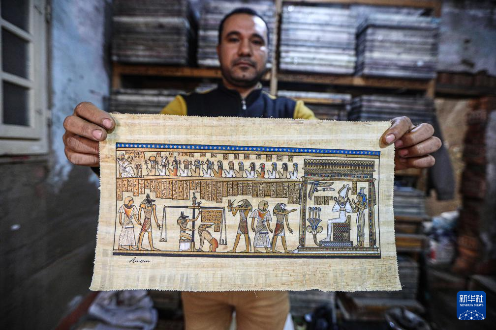 1月16日,在埃及東部省卡拉姆斯村,藝術家瓦格迪·穆罕默德展示用紙莎草紙制作的莎草畫。