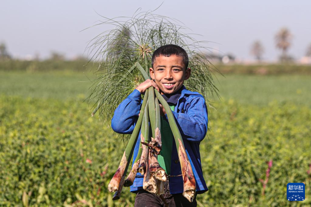 1月16日,在埃及東部省卡拉姆斯村,一名男孩扛著收割的紙莎草。
