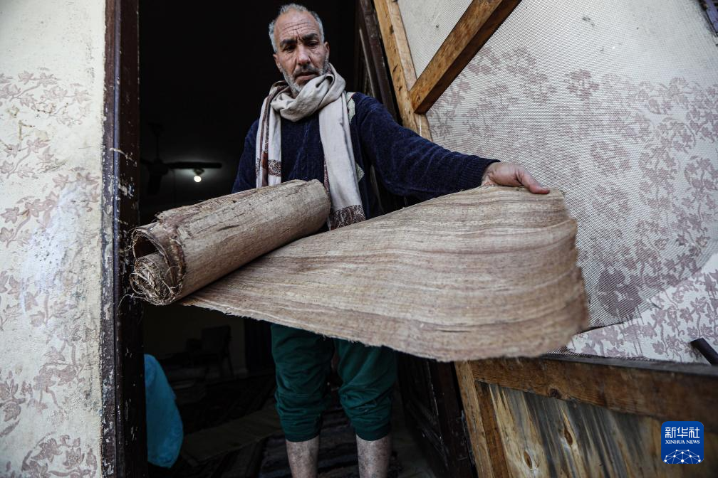 1月16日,在埃及東部省卡拉姆斯村,村民賽義德在自家的紙莎草紙制作作坊展示做好的草紙。