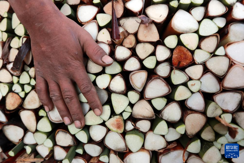 1月16日,在埃及東部省卡拉姆斯村村民賽義德的紙莎草紙制作作坊,紙莎草莖稈被切成段。
