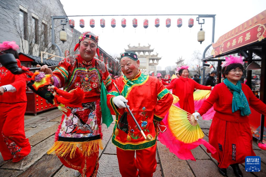1月18日,民間藝人在山東省青島市即墨古城進行秧歌表演。