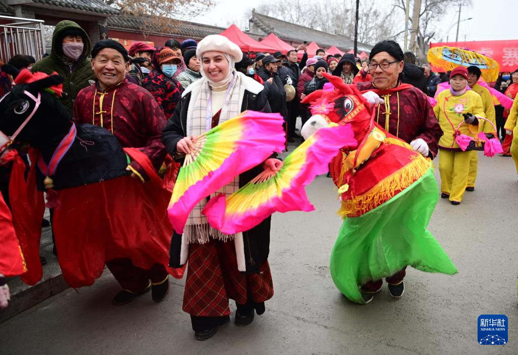 1月18日,在山東省聊城市東昌府區堂邑鎮“濃情臘八”鄉村民俗文化展演活動現場,在聊城大學留學的留學生張娜(中)與當地群眾一起扭秧歌,體驗中國民俗文化。