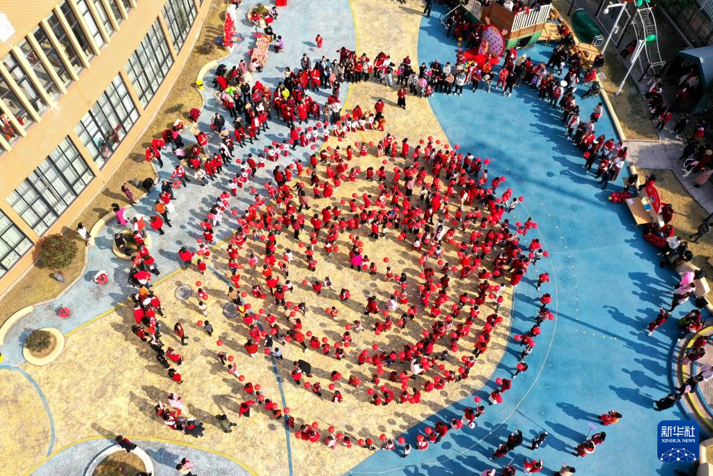 1月18日,浙江省東陽市南馬鎮花園村的花園外國語幼兒園師生舉行主題為“春節的味道”迎新年活動(無人機照片)。