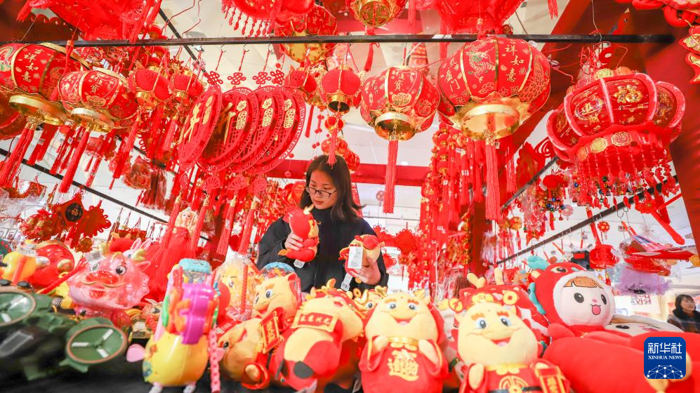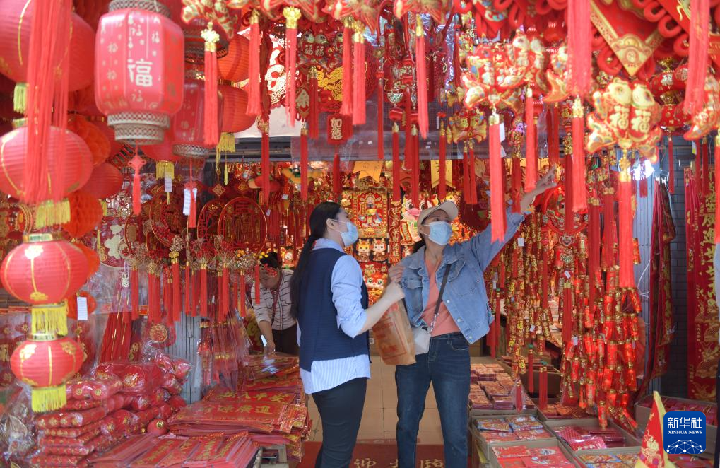 1月18日,市民在河北省唐山市海港經濟開發區節慶年貨市場選購迎春飾品。