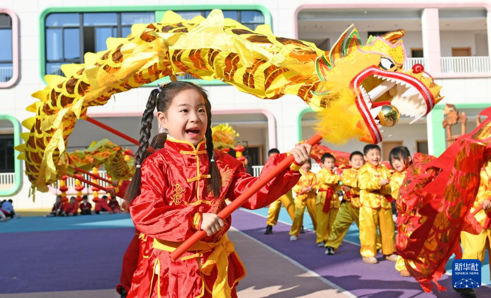 1月18日,浙江省臺州市仙居縣迎暉幼兒園的小朋友在舞龍表演,喜迎龍年新春。