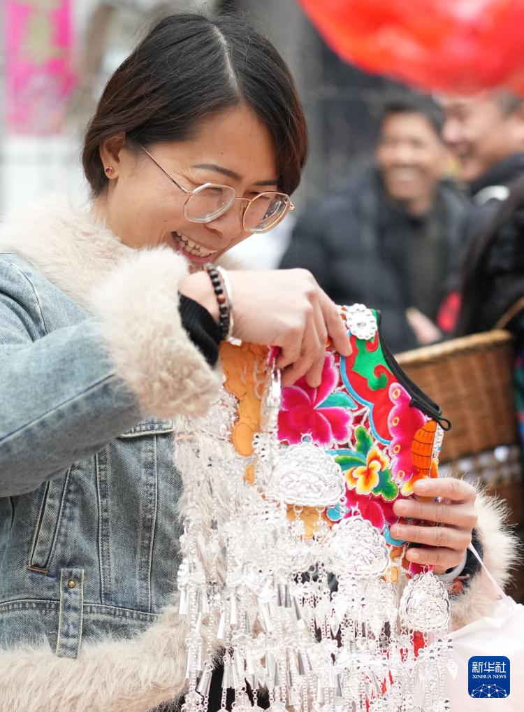 1月18日,顧客在湖南省鳳凰縣山江鎮集市上選購苗族銀飾。