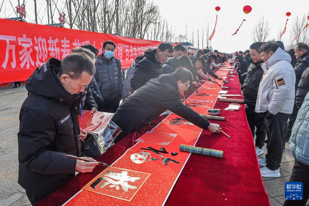 1月18日,在山東省淄博市高青縣舉行的山東鄉村文化旅游節啟動儀式現場,書法愛好者為居民寫福字。