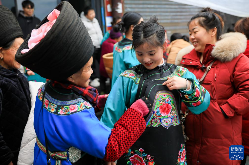 1月18日,顧客在湖南省鳳凰縣山江鎮集市上選購苗服。
