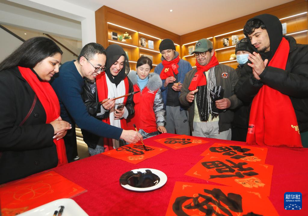 1月18日,“2024春節山東鄉村文化旅游節”青島啟動儀式在即墨古城舉辦,這是書法愛好者與外國留學生一起寫福字。